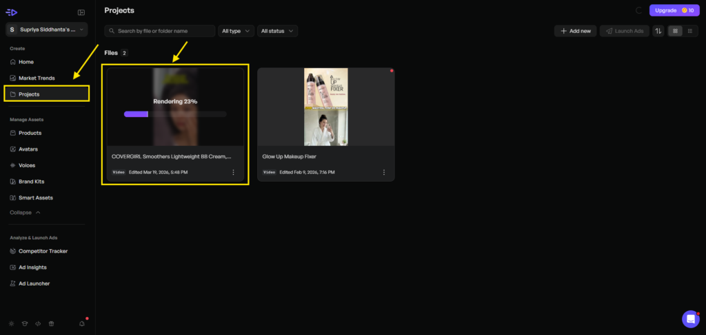 I hit “RENDER” to generate this UGC video. Then go to the “PROJECTS” folder to see the render video.
