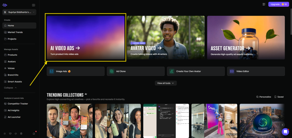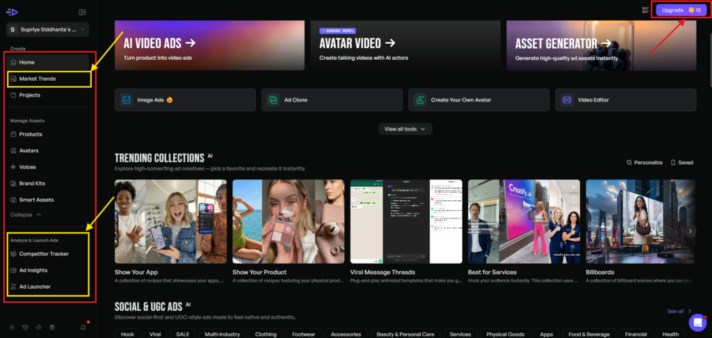 Now you’re in the ‘MAIN DASHBOARD’. Creatify will give you 10 FREE CREDITS for each month for testing purposes.