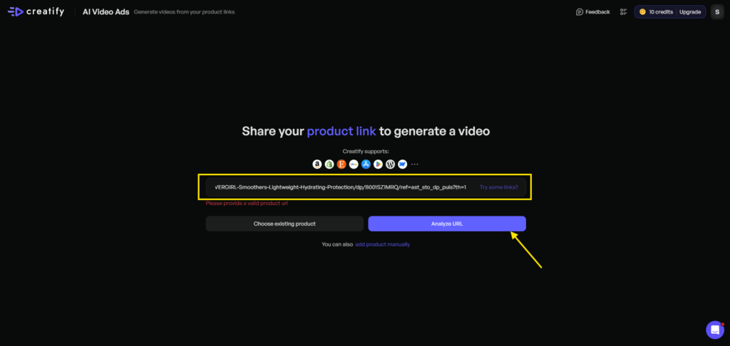 Now hit the “ANALYSE URL”, and Creatify will take some time to analyse your product URL.