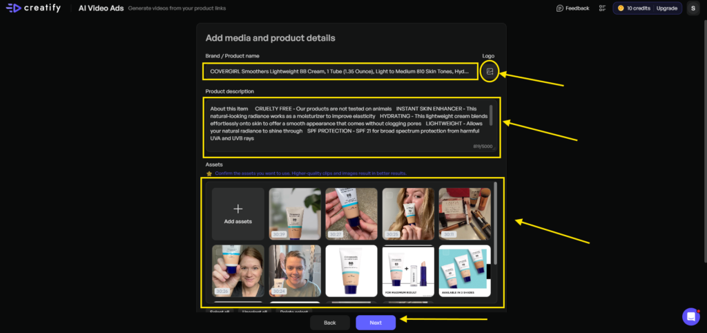 To be honest, this section really surprised me because from that single URL, Creatify pulls the PRODUCT NAME, PRODUCT DETAILS, along with CREATIVE ASSETS, which is a cool thing, I believe…