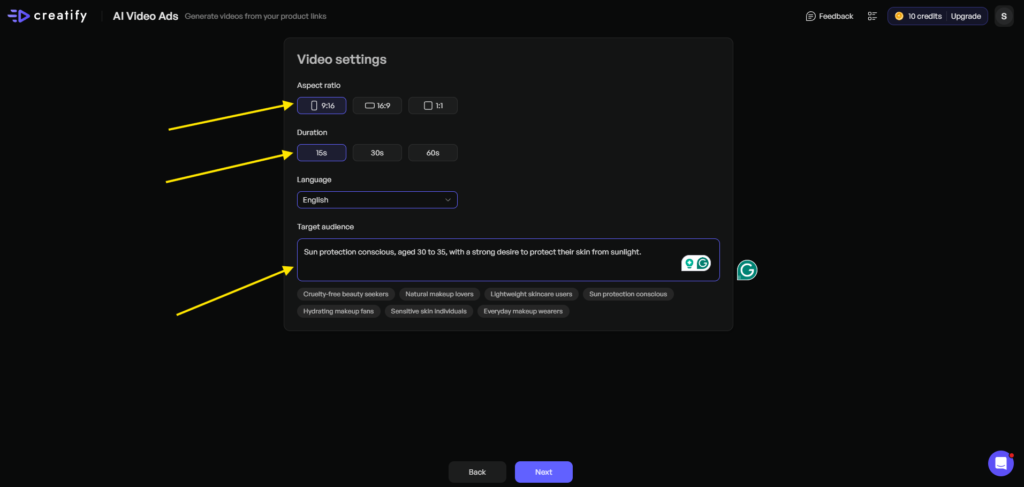 I want to make this UGC Ads for Instagram, so I chose 9:16 and a 15-second duration. Kept the language to English and gave a clear idea about the target audience. Then hit “NEXT”.