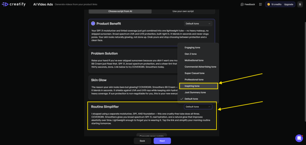 Based on the data you provided, Creatify has generated different scripts with different angles.